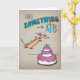 Silly Dachshund est super excité à l'idée de célébrer l'anniversaire de quelqu'un ! Le dessin est réalisé à la main avec des crayons et de l'encre colorés, avant d'être scanné en format numérique. Dachshund saute dans un gâteau d'anniversaire géant à trois couches. Le texte décoratif dit "Il y a quelque chose dans l'air". Couleur complète sur un arrière - plan en papier faux brun.