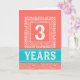 C'est un design distinctif et attrayant en corail, blanc et turquoise. Le numéro 3, en blanc, est placé dans un entourage carré qui est décorativement bordé. Une partie de la frontière est constituée d'un motif tourbillonnant de vagues et elle est complétée par un contour composé du mot "FÉLICITATIONS" qui est écrit quatre fois autour du carré. En dessous se trouve le texte 'YEARS' qui est placé contre un arrière - plan de couleur turquoise, en contraste joliment avec la couleur principale du corail. Sous le mot "ANNÉES" se trouve un motif correspondant à celui qui fait partie de la frontière autour du numéro 3. Cartes Natalie Kinnear