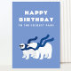 Une jolie carte illustrée présente deux ours polaires cool en lunettes de soleil, conçus pour des anniversaires jumeaux. À l'intérieur de la carte est un intérieur vierge pour vous de faire votre propre message amusant pour deux jumeaux que vous connaissez.