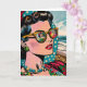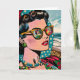Carte vierge. un art de l'air cool dépeint une femme en vacances en train de rebondir sur la plage en regardant une danseuse de hula. C'est fait dans un style d'art de la bande dessinée donnant une ambiance pop art rétro.