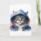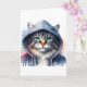 L'aquarelle met en scène un adorable chat tabby habillé d'un sweat - shirt à capuche bleu sur cette carte blanche.