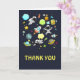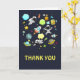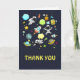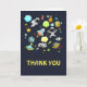 Carte de voeux Merci avec un motif mignon et coloré avec toutes sortes d'éléments thématiques de l'espace. Les images comprennent des astronautes flottant dans leurs combinaisons spatiales blanches. Étoiles, planètes et petits navires-roquettes cool, vaisseaux spatiaux et satellites. Design amusant et fou.