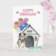 Un mignon chien de berger australien devant une maison avec un gâteau d'anniversaire et des ballons colorés