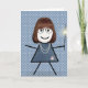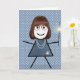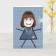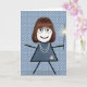 Baguette fille figure dans une robe bleu denim, cheveux, collier de perle, et lunettes tenant un pétillant sur un pois arrière - plan pour la fête des mères.