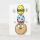 This design shows three egg-shaped figures stacked in a tall, slightly teetering tower on a white background, with a couple of wobble lines hinting at motion 🐇. At the bottom sits a light brown, round character with wide eyes and a furrowed look, as if nervously trying to keep everyone steady for a friend. Above it is a pale blue egg decorated with dark blue polka dots and a jagged red band near the lower edge dotted with small yellow spots, leaning just enough to feel like it’s relying on the base. On top is a bright yellow egg with soft pink polka dots and a green zigzag stripe that has a thin red line running through its center, like a cheerful crown to the stack 🌷. Small highlight marks on each shape suggest a glossy finish, making the colors look slick and candy-like. There is no visible message text on the front, leaving the open white space to frame the trio like a simple stage. Curved motion marks sit to the left and right of the upper two eggs, emphasizing the gentle wobble of the stack.