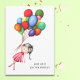 Carte d'adieu simple pour fille avec l'illustration d'une jeune brune qui s'en va avec des ballons colorés. Illustré et dessiné par Patricia Alvarez.
