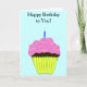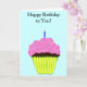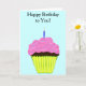 Joyeux anniversaire à vous est écrit en typographie noire contre un arrière - plan bleu turquoise clair. Le cupcake au chocolat gelé rose dans un emballage vert jaune. Bougie blanche flicker bleu. Laissez le verset de la carte, ou personnalisez avec le vôtre. Des images colorées de ballon rond et de ballon cardiaque. Oeuvre et design d'origine © TamiraZDesigns.