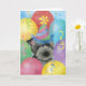 Joyeux salutations d'anniversaire avec ce design mettant en vedette un chiot écossais Terrier, vêtu d'un casquette de fête, entouré de ballons colorés, de confettis et de serpentins.