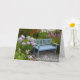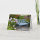 Banc en bois bleu dans le jardin de printemps carte de voeux
