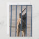 Le guard dog barking behind blue iron bars. Photographe.