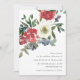 Cette belle faire-part de mariage est ornée d'un bouquet d'aquarelle luxuriant avec des fleurs rouges chic, blanches en ivoire et bleues poussiéreuses, nichées de feuilles verts sauge. Idéal pour une mariage intérieure ou extérieure moderne.