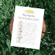 Un jeu amusant pour la soirée révélation de genre est le jeu Baby emojis. Cette carte de jeu présente des fleurs jaunes en haut. Au verso, un ours en peluche, appuyé sur un tonneau de miel, regarde une abeille au miel avec des modèles.