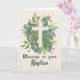 Cette carte Baptême est pour une fille et a eucalyptus et fougères arrangés sous une simple croix. Le texte dit "Bénédictions sur votre baptême".