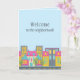 "Bienvenue dans le quartier !" carte. Le design présente un joli quartier urbain sur un arrière - plan bleu clair. Idéal pour condos et appartements.