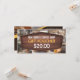 Imaginez l'arôme irrésistible du café fraîchement moulu qui se mélange à la chaleur douce des pâtisseries fraîchement cuites, invitant les clients à s'attarder. Si votre coffee shop dégage cette atmosphère cosy et accueillante, pourquoi ne pas la partager avec le monde par un bon cadeau bien pensé ? Un bon cadeau attrayant pour les coffee shops pour encourager plus de clients à passer par leurs portes avec un design qui a des touches de bois rustique, un arrière - plan de coffee shop défraîchi, le tout dans des tons bruns riches. Sur le devant, vous fixez le prix de votre bon cadeau et sur le dos votre café, l'emplacement, le numéro de téléphone, le courriel et le site Web, ainsi que les conditions de votre offre. Conçu pour capturer l'essence de votre café, ce certificat cadeau non seulement augmentera votre image professionnelle, mais incitera également les clients à éprouver la chaleur et la saveur que vous offrez.