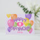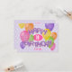 Cette carte d'anniversaire amusante et colorée pour une fille est téléchargeable et contient le message "Joyeux anniversaire" écrit dans des cookies de découpe violet disposés de façon réaliste et fantaisiste sur le devant de la carte entourés de ballons multicolores - message sur le dos et l'âge et le nom de l'enfant peuvent être personnalisés - deux cookies de découpe en forme de ballon accent le dos de la carte - arrière - plan est un motif de petit pois sur le violet pâle - par katz_d_zynes