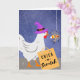 Chick N Scratch, drôle de carte de voeux d'Halloween avec un poulet portant un casquette de sorcière et regardant une araignée tenant un morceau de maïs bonbon. L'arrière - plan est rempli de toiles d'araignée. Le message intérieur a thème poulet Halloween puns. Copyright © Shoaff Ballanger Studios, 2022.