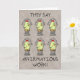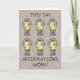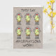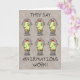 Une carte d'anniversaire humoristique avec six jeunes poulets de dessins animés debout au printemps avec les mots "poule de printemps" sur chacun d'eux et le texte "Ils disent que les affirmations fonctionnent ! Ce design de voeux d'anniversaire amusant a pour but d'amuser un peu l'idée qu'une simple répétition d'une phrase peut la rendre réalité. L'intérieur de la carte dit "Alors. .. Vous sentez-vous plus jeune ? Joyeux anniversaire !"