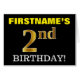 Ce design de carte de voeux d’anniversaire comporte un message comme "FIRSTNAME’S 2nd BIRTHDAY!", avec le "2nd" ayant une apparence de couleur fausse/imitation or. Le nom du destinataire sur le devant peut être customisé, et l’arrière - plan avant est de couleur noire. Il comporte également un message de voeux d'anniversaire personnalisable à l'intérieur. Une carte de voeux comme celle-ci pourrait peut-être être remise à quelqu'un pour célébrer son deuxième anniversaire. [~Z0000183]
