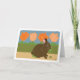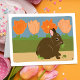 Ce mignon lapin est coupable de manger les plantes du jardin. lapin Brown devant la haie verte avec tulipes et ciel en arrière - plan. L'image ressemble à du papier peint à la main. Utilisez pour l'équinoxe de printemps, l'équinoxe de mars, le premier jour du printemps, Pâques, l'équinoxe vernal et la terre mère. Brown, pêche, vert, brun et rose. À l'intérieur : vide