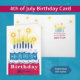 Des étoiles et des rayures décorent la glace sur un gâteau d'anniversaire 2 couches rouge, blanc et bleu avec des bougies et des lustres sur le dessus. Express tes souhaits heureux et le rendre personnel en customisant le nom. ©Mindy Pierce