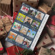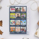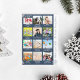 Carte de Noël ou de Fête Bleue et blanche avec un collage photo de 12, des flocons de neige et du texte pour chaque mois de l'année. Sur le côté, il a la citation "What a year" et le nom de famille ou tout texte personnalisé que vous souhaitez ajouter.