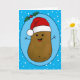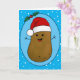 Adorable drôle mignonne joyeux patate de dessin animé brun portant un chapeau de Père Noël rouge et blanc. La pomme de terre est dans un style d'art cartoon et marron coloré, il a des bras et des doigts en bâton et un grand sourire heureux avec des points pour les yeux. Le chapeau de Père Noël sur sa tête est rouge avec une garniture blanche et un pompon blanc suspendu. Il est à l'intérieur d'une forme ovale bleu clair avec un cadre bleu foncé et deux feuilles verts saints avec deux baies rouges au sommet de l'ovale. La couleur arrière - plan est un bleu clair vif avec des flocons blancs qui flottent sur le point de donner une ambiance festive à cette mignonne carte saisonnière. À l'intérieur de la carte sont des modèles de texte à laisser tels qu'ils sont ou à remplacer le texte par votre propre message. A l'intérieur de la carte et à l'arrière se trouve la même pomme de terre heureuse.