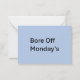 Ajoutez une touche gaie à vos notes avec notre carte de billet plat sarcastique "Bore Off Monday's" ! Idéal pour envoyer un message humoristique ou simplement égayer la journée de quelqu'un, cette carte se fond avec le style, ce qui en fait un choix parfait pour ceux qui apprécient une touche de sarcasme.