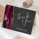 Cette élégante carte de remerciements mariage moderne est ornée d'une bordure en aquarelle bordeaux et d'une parties scintillant en faux argent. Le texte personnalisable combine les mots "Merci" en écriture manuscrite blanche et les noms de la mariée et du marié en caractères italiques blancs sur un arrière - plan gris charbon de bois.