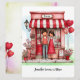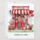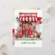 Personnalisez votre Saint-Valentin pour lui ou elle sur cette douce carte de vœux plate imprimée avec un adorable couple et leur scène de boutique peu commune remplie de nombreux cœurs, ballons et détails de fleurs. Modifiez vos noms, monogrammes et autres textes au recto et au verso. L'illustration de style aquarelle a un fond pastel abstrait au recto et au verso. Créé dans une palette de couleurs principalement rouges et roses, avec votre choix de tailles.