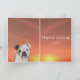 Cette carte de voeux modifiable montre mon dessin d'un Bulldog anglais contre un arrière - plan de coucher de soleil orange, et la légende "Missing you on the front" et "Hope to Catch up soon" à l'intérieur.