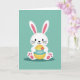 This design shows a white, bunny-like character centered on a smooth teal background, looking straight ahead with a gentle, friendly gaze 🐰. Its long ears stand upright with soft pink inner details, matching the pink pads on its oversized feet, and thin whiskers frame a tiny nose. The character’s arms wrap around a large egg-shaped decoration as if holding it close like a small gift for someone special. The egg is striped in warm golden yellow and light aqua, with the aqua tones tying back to the background for a calm, cozy look. Near the top area, simple Easter greeting text sits in a neat line, set in white so it stands out clearly against the teal. A small fuchsia flower with a yellow center rests on one aqua stripe, adding a sweet, affectionate touch 🌷. A soft shadow sits directly beneath the character, anchoring it to the surface while the teal backdrop remains smooth and untextured.