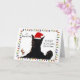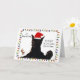 Carte de vœux drôle de Noël avec un adorable chat noir portant un chapeau de Père Noël et faisant une grimace avec le message "Ça commence à sentir beaucoup Noël".