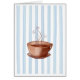 Illustration d'une tasse de café apaisante et vapeur posée sur un arrière - plan rayé bleu et blanc. Idéal pour un brunch, un café ou simplement pour se retrouver entre amis amateurs de caféine ! Correspond également à :