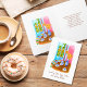 Cadre Rustique Floral Confortable Café Paraissent Meilleures Carte. Cette carte de voeux Feeling Better présente un design cosy et coloré pour élever les esprits. L'illustration présente un décor de café Talavera plein de vitalité sur une table en bois rustique, entourée de fleurs jaunes-oranges chaudes sur une base florale. La toile de fond est ornée d'un mur rose rustique et d'une fenêtre bleue en bois qui s'ouvre sur un jardin luxuriant avec un feuillage vert qui s'ouvre à travers. Un sarape mexicain coloré trône sur un côté de la table, ajoutant une touche de tradition vivante. La scène chaleureuse et accueillante évoque le confort, le confort et le sens de la guérison, parfait pour envoyer des souhaits sincères pour un prompt rétablissement et des jours plus brillants à venir.