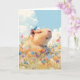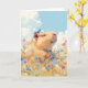 Cette carte de voeux fantaisiste présente un capybara paisible, profitant d'une journée ensoleillée dans une prairie fleurie et colorée, avec un petit oiseau bleu perché joyeusement sur la tête. L’expression détendue du capybara et les floraisons vibrantes créent une scène remplie de joie et de tranquillité, parfaite pour apporter un sourire à la journée de tous. Idéale pour les amoureux des animaux et les amateurs d'art d'inspiration nature, cette carte de charme est adaptée aux anniversaires, aux notes de remerciement, ou simplement pour diffuser le bonheur. Ses couleurs douces et son thème serein en font un joli complément à toute occasion.