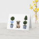 Cette papeterie présente un portrait aquarelle d'un chiot carlin assis entre deux topiaires de style chinoiserie.