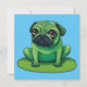 Carlin vert mignon ressemblant à une grenouille assise sur un lilipad. La couleur Arrière - plan peut être modifiée.