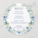 Laissez-vous tenter par l'élégance vibrante de notre carte de menu mariage de printemps/été rustique et fantaisiste. Décoré d'une couronne de délicate couronne d'aquarelle bleue florale, il ajoute une touche parfaite pour rehausser votre expérience culinaire.