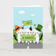 This card shows three stylized white cats lined up on a simple gray road, set in front of rolling emerald hills and a calm blue sky with puffy white clouds. Their close spacing and matching little “U”-shaped smiles give the scene a cozy, friendly closeness, like they’re posing together for a sweet holiday photo 💚. The left cat wears an orange top hat and holds a small flag that says “HAPPY” in dark letters beside a golden star. The middle cat has a black patch on one ear and helps hold a wide lime-green banner across the group. “ST. PATRICK’S” appears in bold, dark lettering centered on that banner, making it the main text on the front. On the right, the third cat wears a green top hat, balancing the color across the trio, while their tiny black eyes and rosy cheeks add a gentle, affectionate look. A single green shamrock floats near the upper right against the sky, like a little ☘️ hovering above the hills.