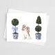 Cette papeterie présente un portrait aquarelle d'un roi Cavalier Charles Spaniel avec des arcs de ruban bleu dans ses oreilles assis entre deux topiaires de style chinoiserie.