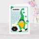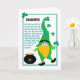 Une carte de voeux amusante pour votre fille le jour de la Saint Patrick, avec un joli leprechaun dansant, tenant un shamrock, à côté d'une casserole d'or. Il y a une bordure vert foncé, doublée et la Prière celtique d'origine, en lettres vertes, à côté du leprechaun. Le leprechaun a un très grand casquette, dans un motif vert, une grande barbe de gingembre, un nez énorme, des manches rayées et des chaussettes et des chaussures noires avec des boucles pour assortir son bandeau. En haut, en lettres noires, se trouve le mot "FILLE" et le message intérieur est facile à customiser ou à supprimer.