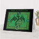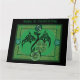 Dragon noir tribal avec ailes de noeud celtique.Des nuances si noeud vert et celtique travaillent tout derrière et autour du dragon et quatre feuilles de trèfle.
