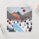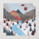 Un magnifique paysage aux textures uniques montrant un paysage de rivière et de montagne avec un renard en chasse à mi-sauts dans la neige dans les tons rouge, vert, bleu et beige.
