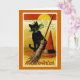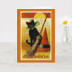 Carte de voeux Halloween vintage illustration montrant un chat noir, balai sorcier et casquette avec le texte "Friendly Fairy Witch or Fay, remplir le souhait que vous souhaitez aujourd'hui."