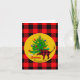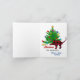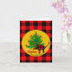Cartes de vœux pliées festives rustiques avec chat et arbre de Noël, nom de famille personnalisé et signatures personnalisées soulignées d'un motif à carreaux bœuf rouge et noir.