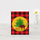 Cartes de vœux pliées festives rustiques avec chat et sapin de Noël, nom de famille personnalisé et signatures personnalisées soulignées d'un motif à carreaux buffalo rouge et noir.