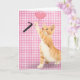 Chatte tabby or avec ballon de coeur rose pour 7ème anniversaire sur arrière - plan rose et blanc en vichy.