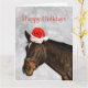 Cheval thème - cheval brun souriant portant un casquette de Noël Père Noël rouge dressé sur un arrière - plan de bokeh neige argenté. Happy Holidays en police rouge vif peut être personnalisé avec votre propre message.