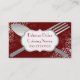 Carte de visite rouge-foncé élégant, avec des graphiques d'une grandes fourchette et cuillère argentées de ton, et flourishes blancs élégants, dans les coins. Une plaque blanche et argentée décorative des textes de ton, au-dessus de l'argenterie, a le texte rouge fait sur commande. Le dos de la carte est fait dans un rouge foncé, avec le texte blanc fait sur commande prêt à personnaliser. Élégant tenez la carte qui part d'une grande impression durable pour votre restauration ou n'importe quelle entreprise de services de nourriture.